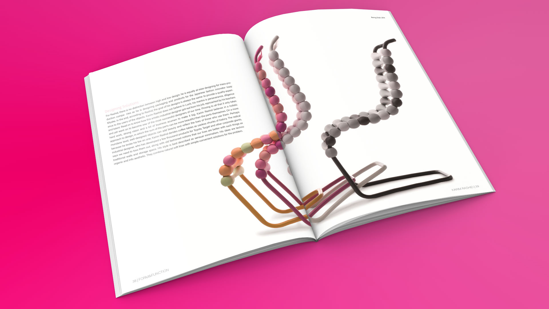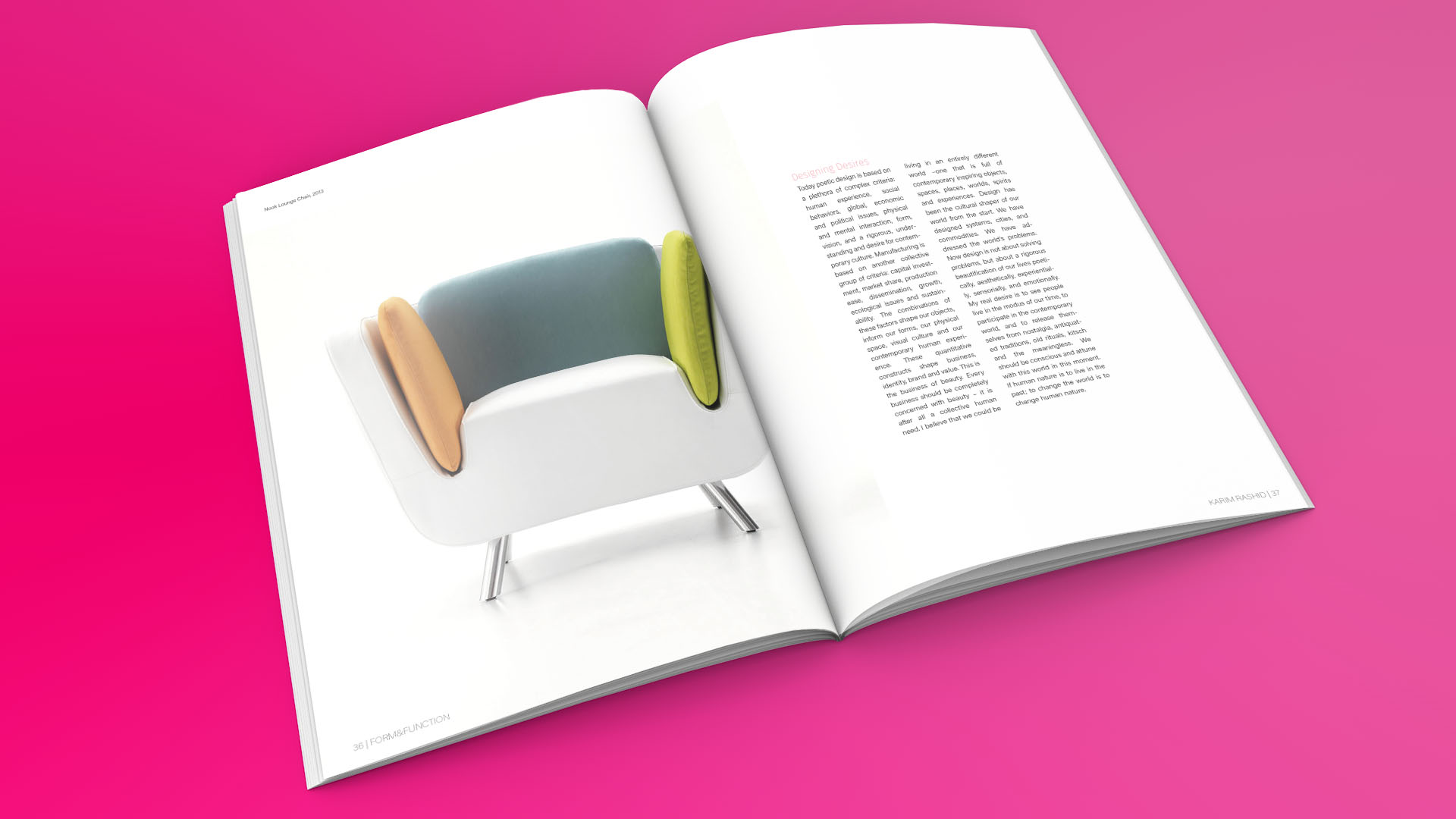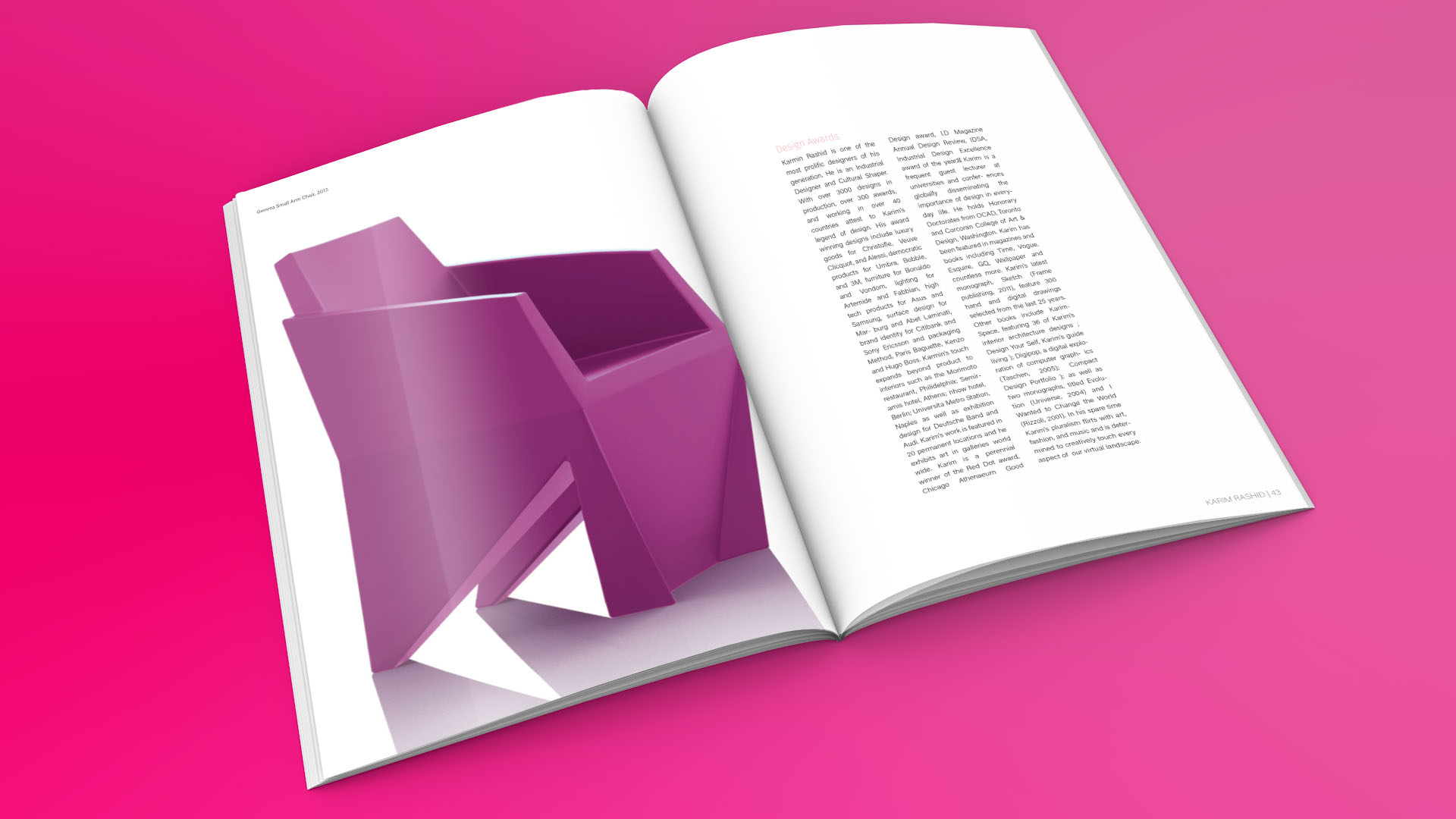 Sensual Minimalism is the combination of sex and minimalism design combined in the style of Karim Rashid. Using articles written about the designer's unique style, Sensual Minimalism was created to reflect the writing in a new way. Each aspect of the design was meant to symbolize the ideal minimalist look and create a sense of equality and balance between the images and text on the spreads.